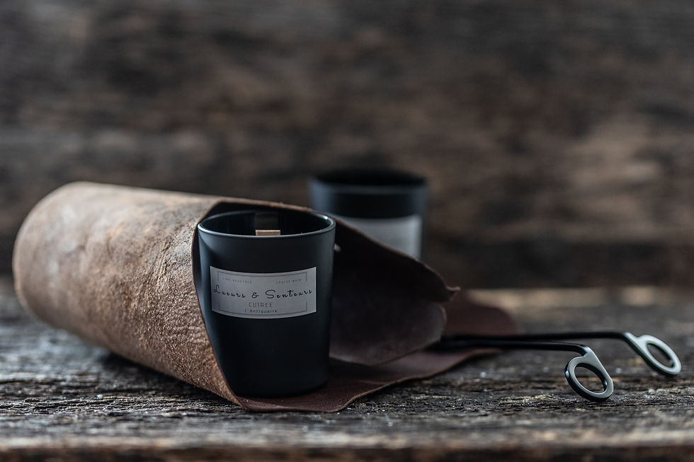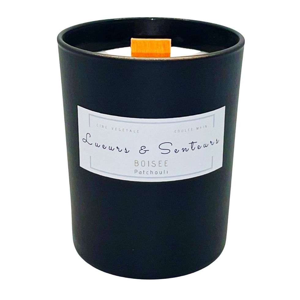 Bougies d'ambiance naturellement parfumées issues d'une création française et d'une fabrication artisanale présentées dans des récipients de qualité laqué noir et blanc mat, sans plastique.
